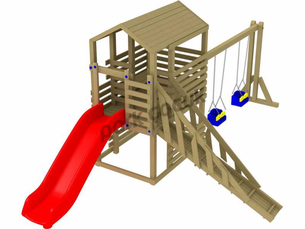 AHŞAP OYUN PARKI-2 ADET PLASTİK OTURAKLI SALINCAK, 1 PLASTİK DÜZ KAYDIRAK, AHŞAP ÇATI, EMPRENYELİ 1. SINIF İTHAL ÇAM KERESTESİNDEN İMAL EDİLMEKTEDİR.